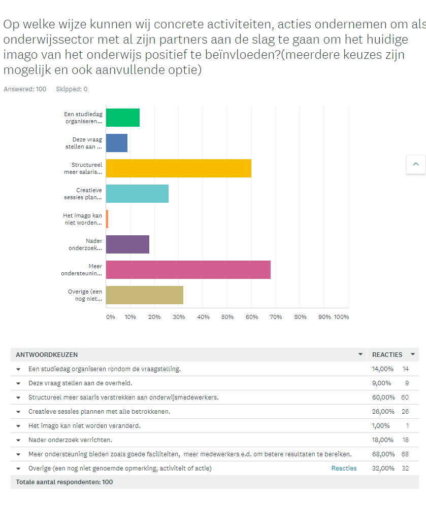 Hier de resultaten op de gestelde vraag in de poll: “Hoe kunnen wij het imago van het onderwijs in Nederland verbeteren? Binnen een tijdsbestek van 16 uur namen meer dan 100 deelnemers deel aan deze poll en hadden we niet gerekend op zo’n grote deelname. Hartelijk dank voor alle reacties en suggesties hoe nu verder te gaan zijn van harte welkom.
