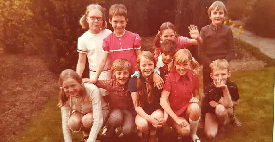 Een terugblik met een foto die zo’n 50 jaar oud is tijdens verjaardagsfeest van buurmeisje Jessy (linksboven- en anderen zie boven rechts) Ronny, bukkende Elleke en zwaaiende jeugdvriendin Ineke, René en linksonder (onbekend voor mij) me myself & I, mijn zus Rita met blauwe jurk en lichtblauwe strikken, Marianne en Jos.
