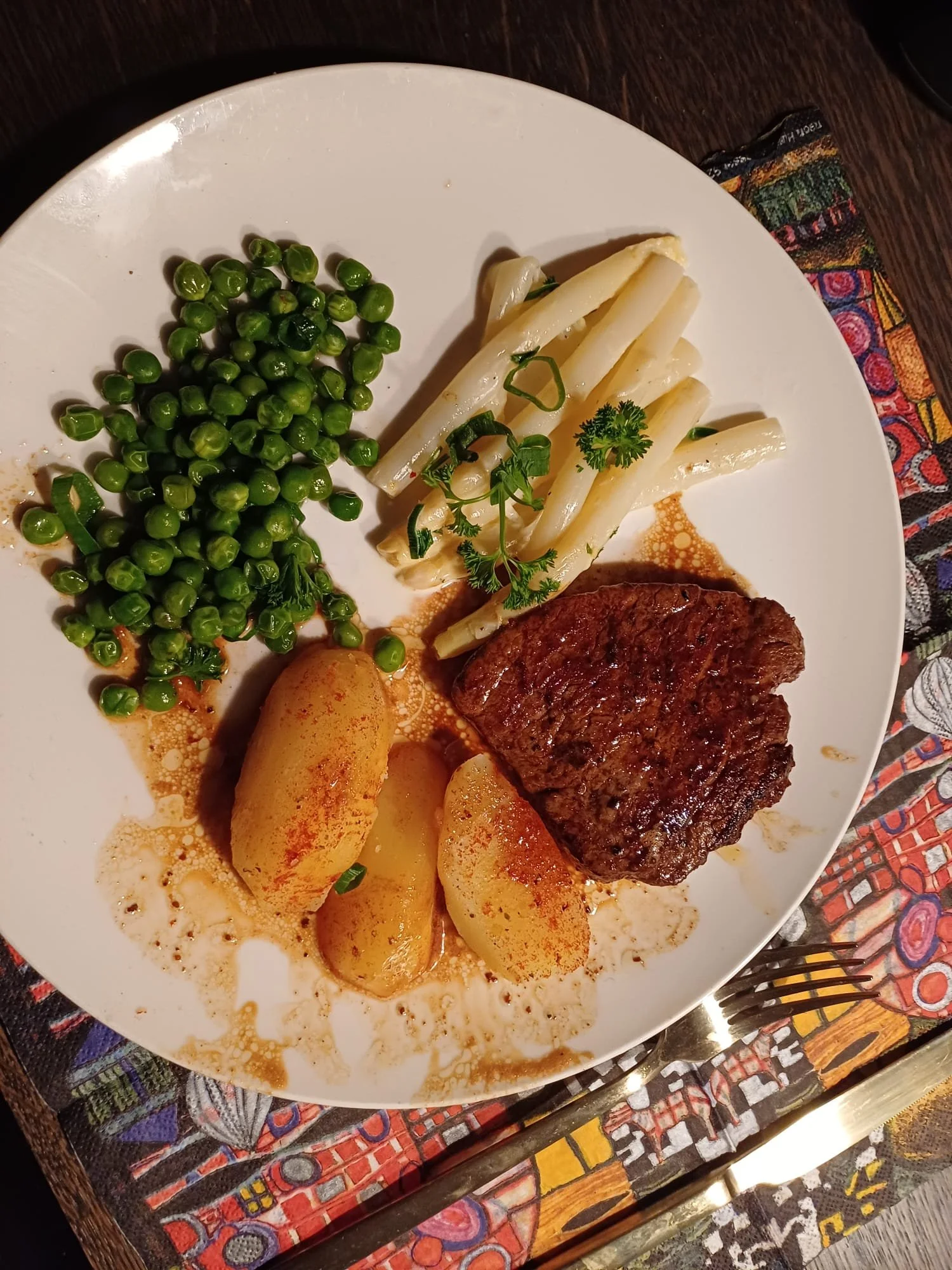 Ik kookte net als een jaar terug voor mam een stukje gekruide ossenhaas met witte asperges, erwten en Levanto aardappelen.Ze had toen al wekenlang bijna zoutloos gegeten en nu genoot ik hier dubbel van met haar foto tegenover me en at ik voor twee. Nu maakte ik wel een foto hiervan en niet van de stukjes sinaasappel en appel die ik ook smakelijk verorberde.